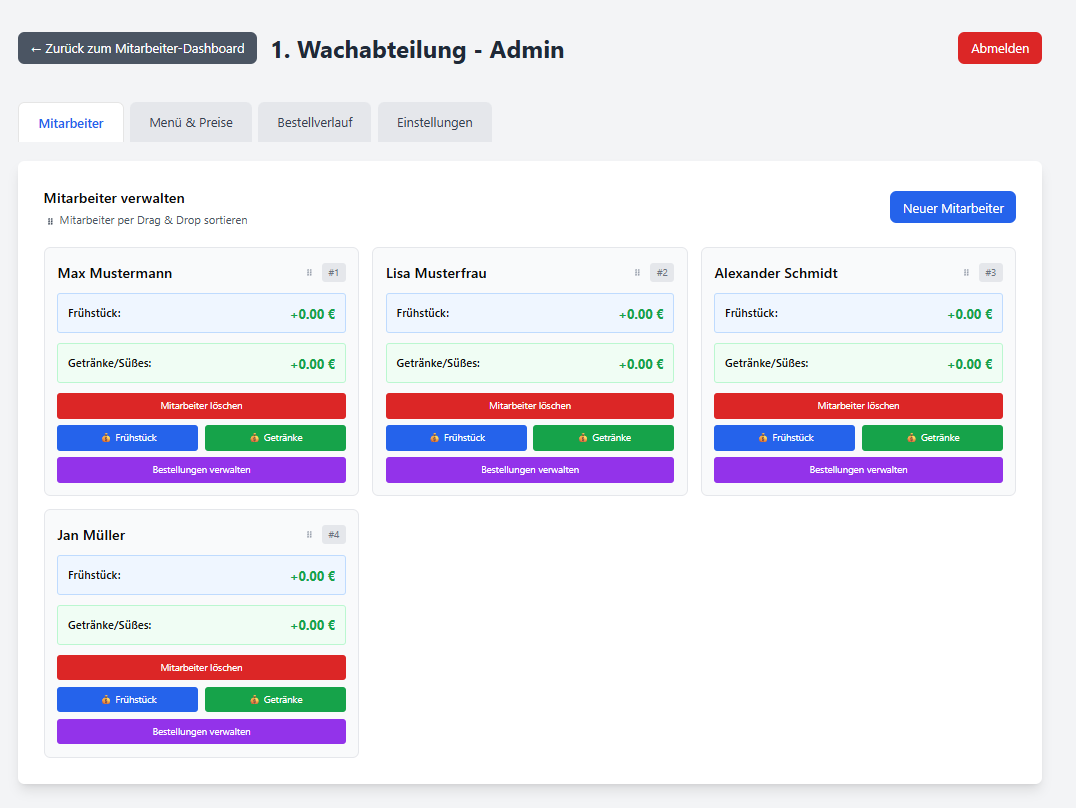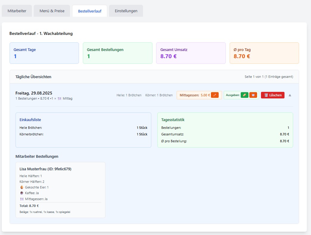 Tägliche und historische Auswertungen. Admin-Dashboard mit Statistiken, Bestellverlauf und Mitarbeiterverwaltung.