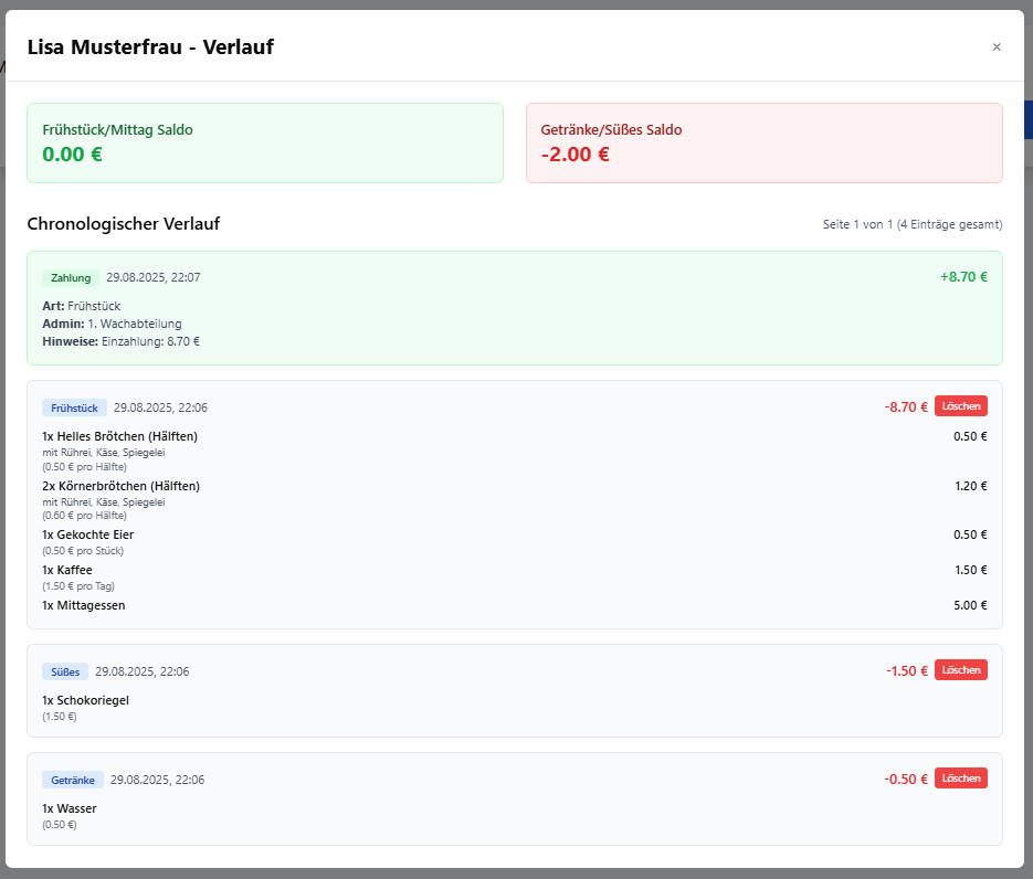 Getrennte Salden für Frühstück/Mittag und Getränke/Süßes. Chronologische Übersicht aller Transaktionen und Zahlungen.