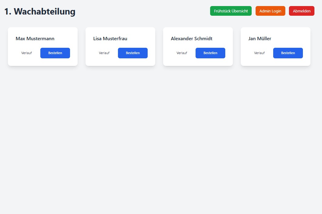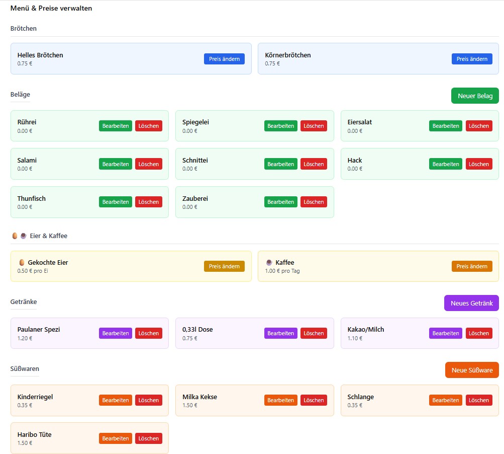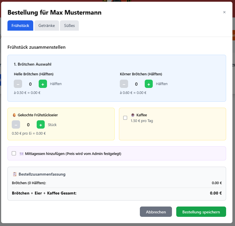 Frühstück, Mittagessen, Getränke und Süßigkeiten. Einfache Bestellung mit automatischer Preisberechnung und Saldo-Verwaltung.