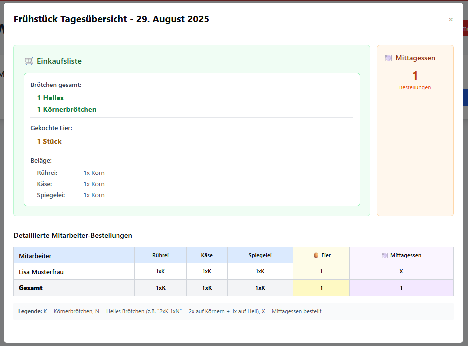 Tägliche und historische Auswertungen. Admin-Dashboard mit Statistiken, Bestellverlauf und Mitarbeiterverwaltung.